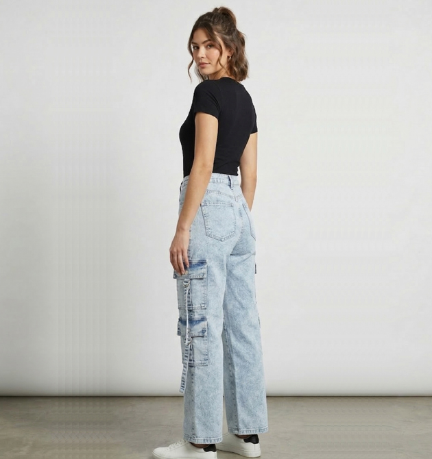 Fabric: Durable Cotton Denim Color: Light Blue (Acid Wash) Fit: Relaxed Straight Fit / High-Rise Style: Cargo / Streetwear Closure: Zip Fly & Button