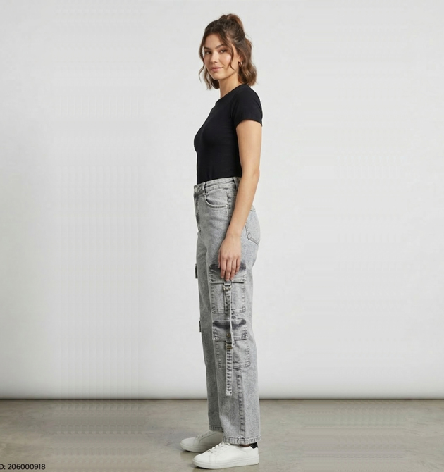 Fabric: Premium Cotton Denim Color: Grey Acid Wash Fit: Relaxed Straight / High-Rise Style: Streetwear / Utility Cargo Closure: Zip Fly and Top Button