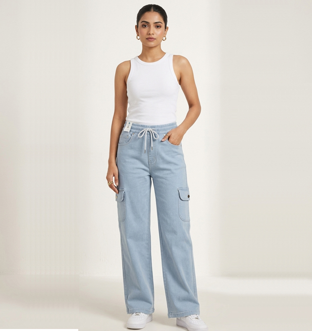 Fabric: Premium Lightweight Cotton Denim Color: Light Blue (Sky Wash) Fit: Relaxed Fit / Wide-Leg Waist: High-Rise / Elastic with Drawstring Style: Denim Jogger / Cargo Hybrid