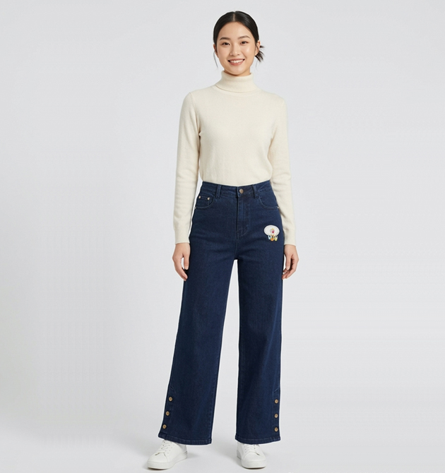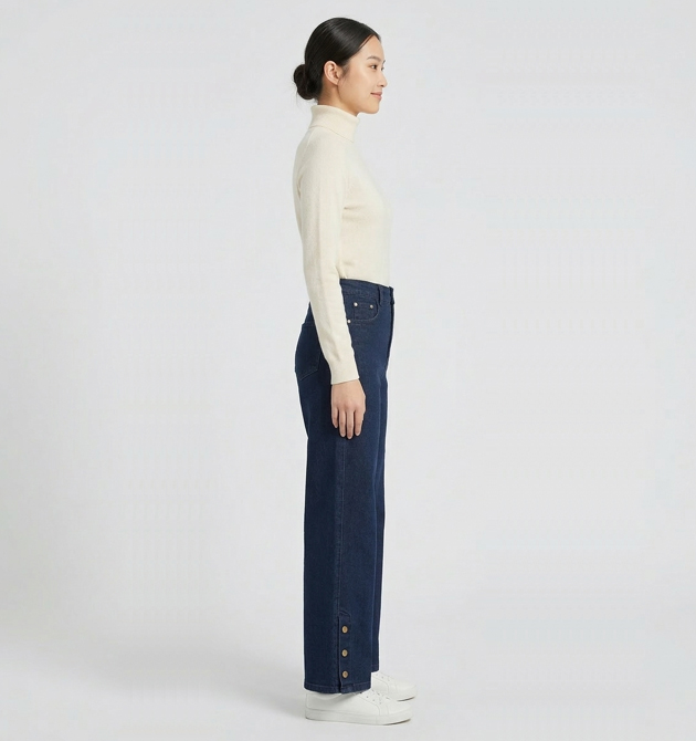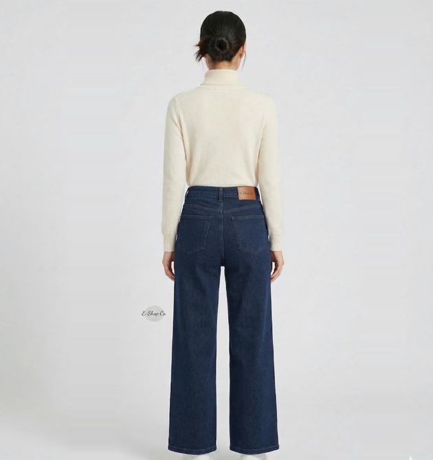 Fabric: Premium Cotton Denim Color: Dark Indigo Blue Fit: Wide-Leg / High-Rise Style: Modern Classic with Decorative Detailing Closure: Zip Fly with Top Button