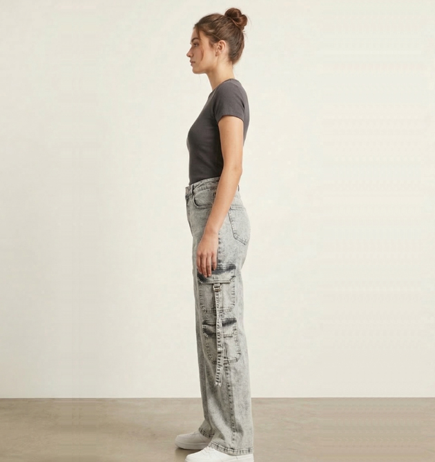 Fabric: Premium 100% Cotton Denim Color: Grey Snow Wash / Acid Grey Fit: Relaxed Straight Fit / High-Rise Style: Streetwear / Techwear Cargo Closure: Standard Zip Fly and Metallic Button