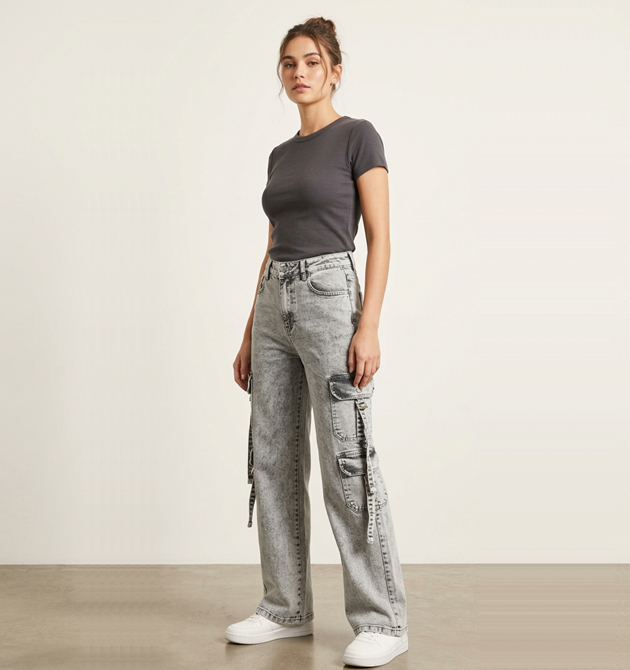 Fabric: Premium 100% Cotton Denim Color: Grey Snow Wash / Acid Grey Fit: Relaxed Straight Fit / High-Rise Style: Streetwear / Techwear Cargo Closure: Standard Zip Fly and Metallic Button
