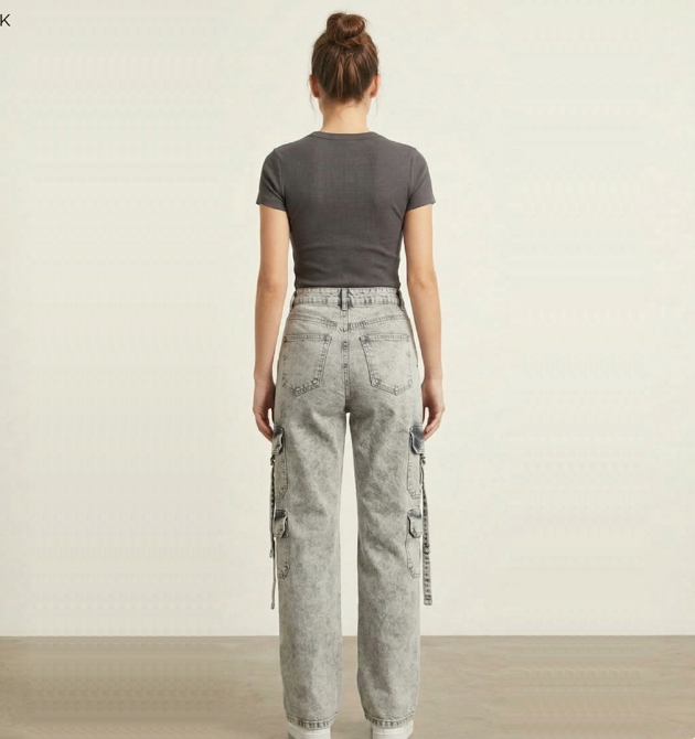 High-Rise Grey Snow Wash Cargo Jeans (SIZE -40)