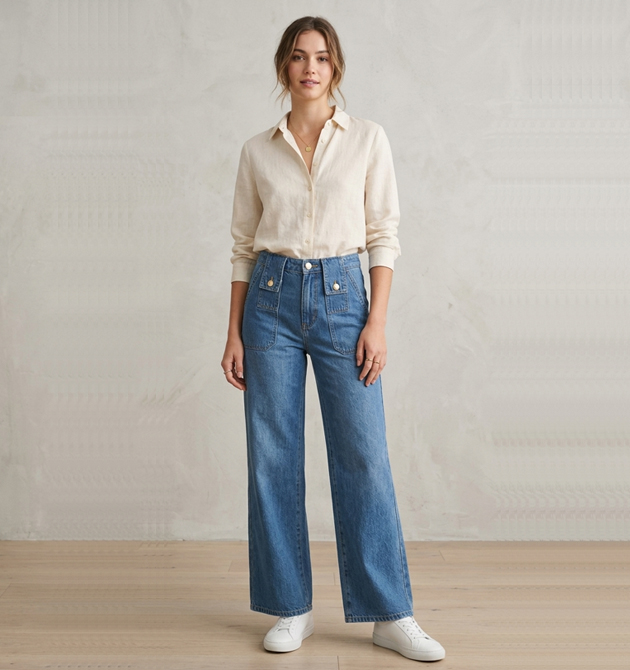 Fabric: High-Quality Cotton Denim Color: Medium Blue Fit: Wide-Leg / High-Rise Style: Sailor-Inspired / Modern Classic Closure: Front Zip Fly with Metallic Top Button