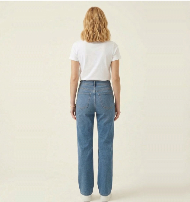 Fabric: High-Quality Cotton Denim Color: Medium Blue Fit: Wide-Leg / High-Rise Style: Sailor-Inspired / Modern Classic Closure: Front Zip Fly with Metallic Top Button