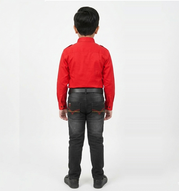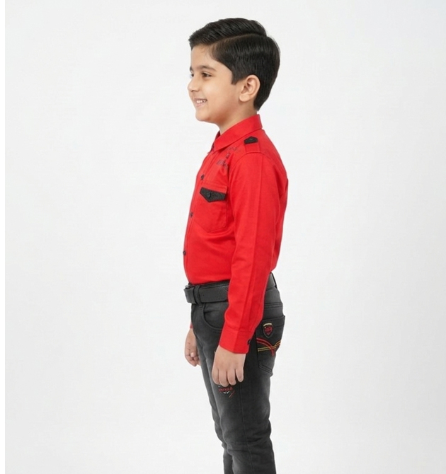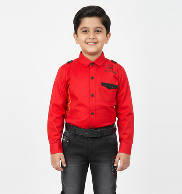 A bright yellow, long-sleeved button-down shirt. It features a sharp collar, black buttons, and a single chest pocket with a black flap detail. There is also stylized black text on the left chest area and orange graphic detailing on the right sleeve,