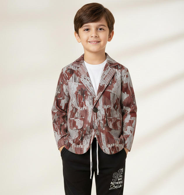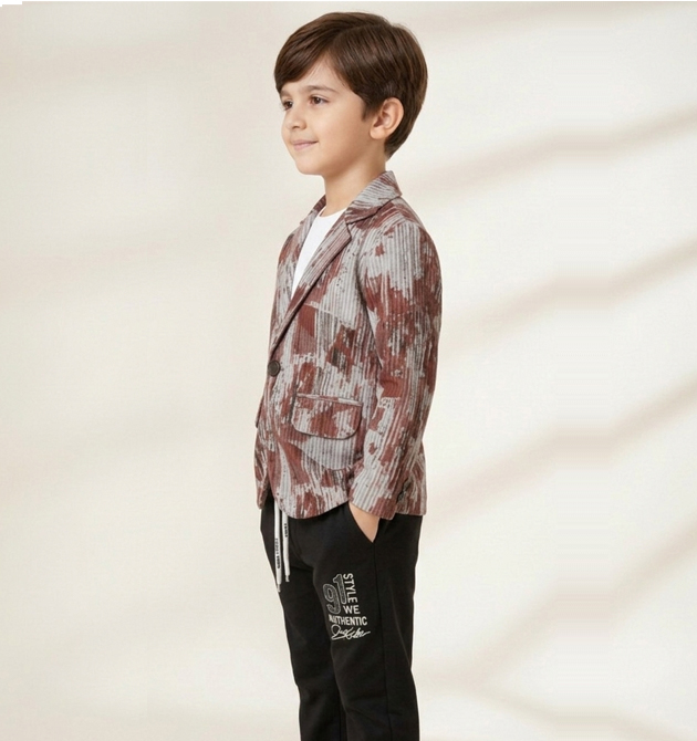 Style: A modern "athleisure-formal" fusion, featuring a structured blazer over a casual t-shirt and graphic joggers.