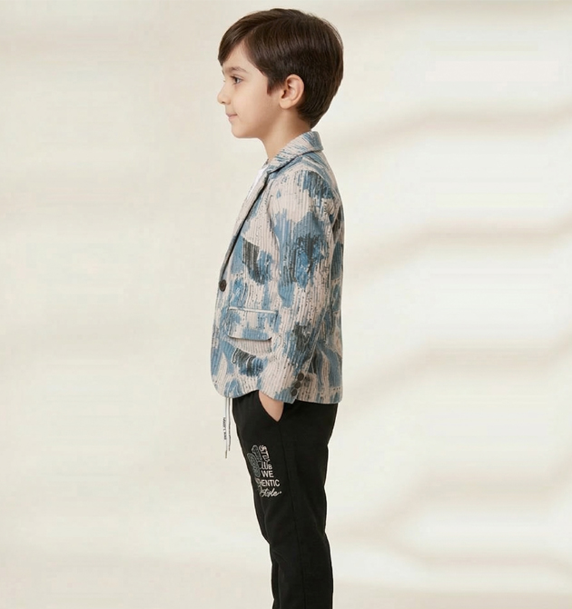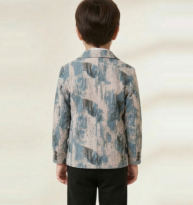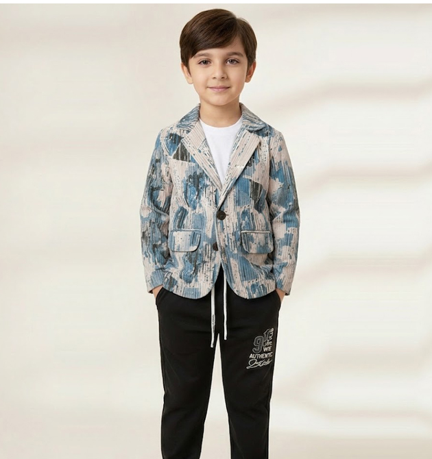 * Style: A trendy fusion of formal tailoring and urban streetwear. * Color Palette: Cool Blue and Slate Grey abstract prints contrasted with classic Black. * Occasion: Ideal for parties, festive gatherings, evening events, or stylish casual outings.