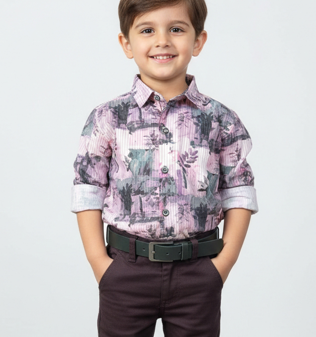 Abstract Print Shirt: A vibrant button-down shirt featuring an artistic mix of floral and tropical motifs in shades of lavender, charcoal, and white. The rolled-up sleeves and structured collar give it a "cool-guy" casual vibe.