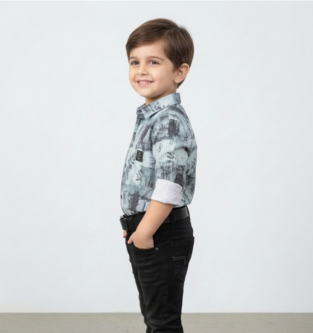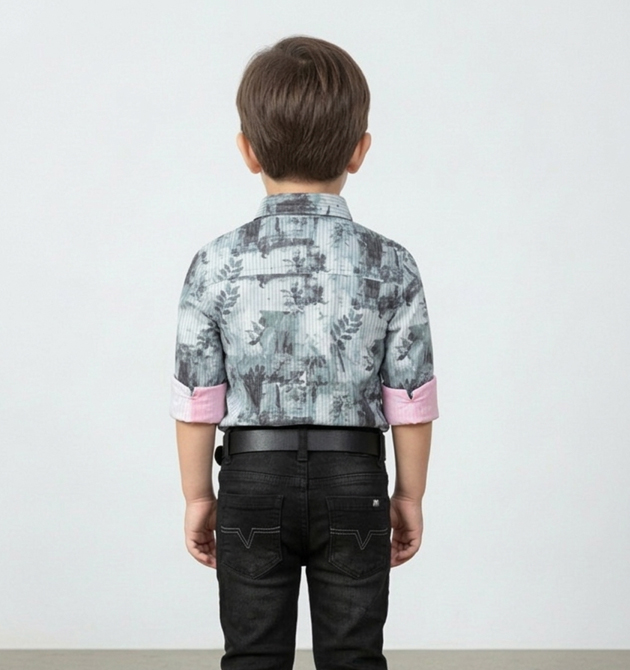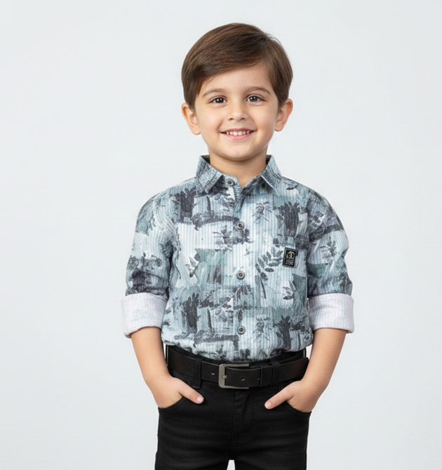 Artistic Scenic Print Shirt: A premium button-down shirt featuring an abstract "wilderness" print in shades of sage green, slate grey, and charcoal. The structured collar and contrast-lined sleeves (perfect for rolling up) add a mature touch to a youthful design.