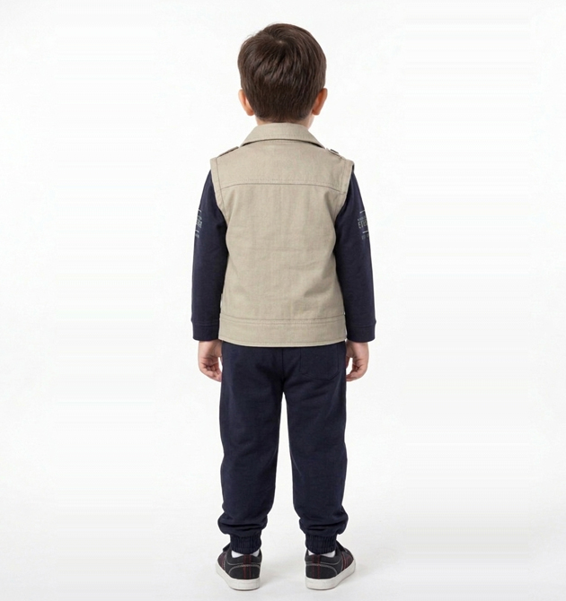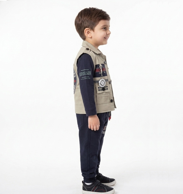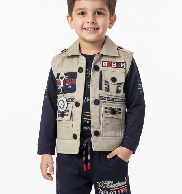Material: Durable cotton-blend fabric designed to withstand rough-and-tumble play. Style: Casual / Streetwear / Outdoor. Fit: Relaxed Fit (True to size). Set Includes: 1 Long-sleeve T-shirt, 1 Khaki Utility Vest, and 1 Pair of Joggers