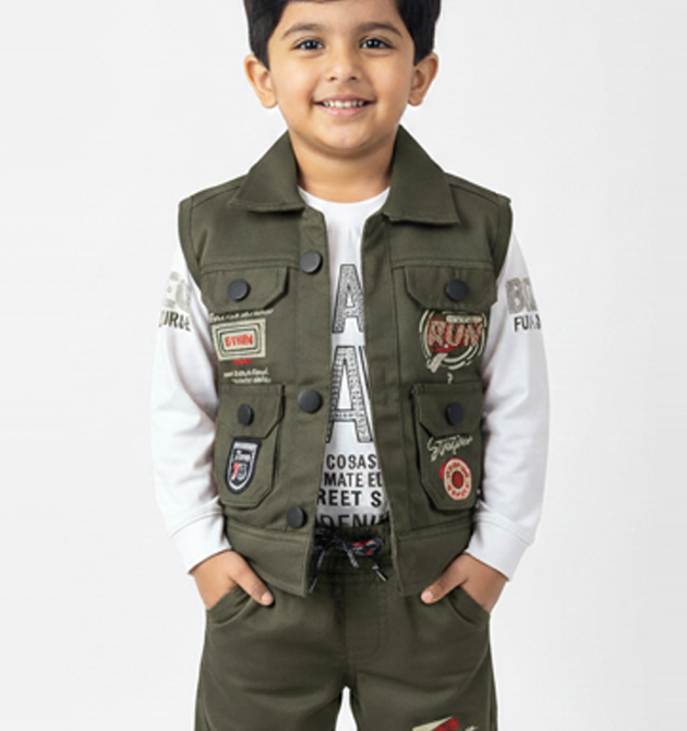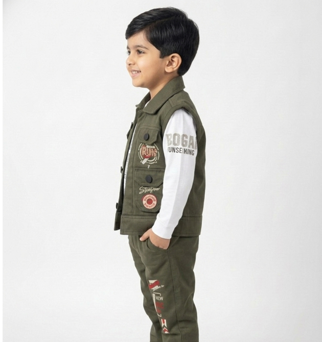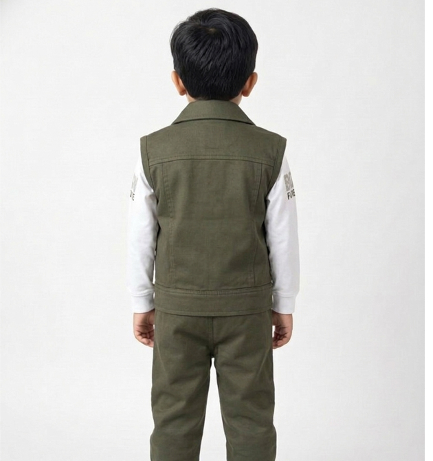 Set Includes: 1 Olive Utility Vest, 1 White Long-sleeve T-shirt, and 1 Pair of Olive Joggers.